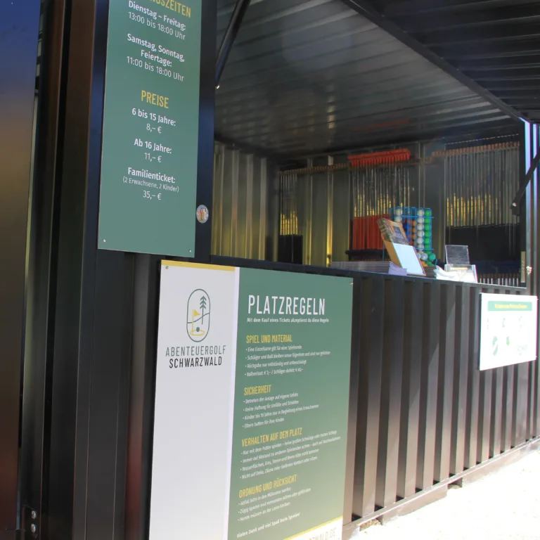 Am 19.7.2025 werden wir die ersten 9 fertigen Bahnen zum Spielen freigeben – zum Sonderpreis von 5 € pro Person. Bis zur Eröffnung am 23.8.2025 gilt das Pre-Opening-Angebot. Geöffnet ist Samstag und Sonntag von 11-18 Uhr.